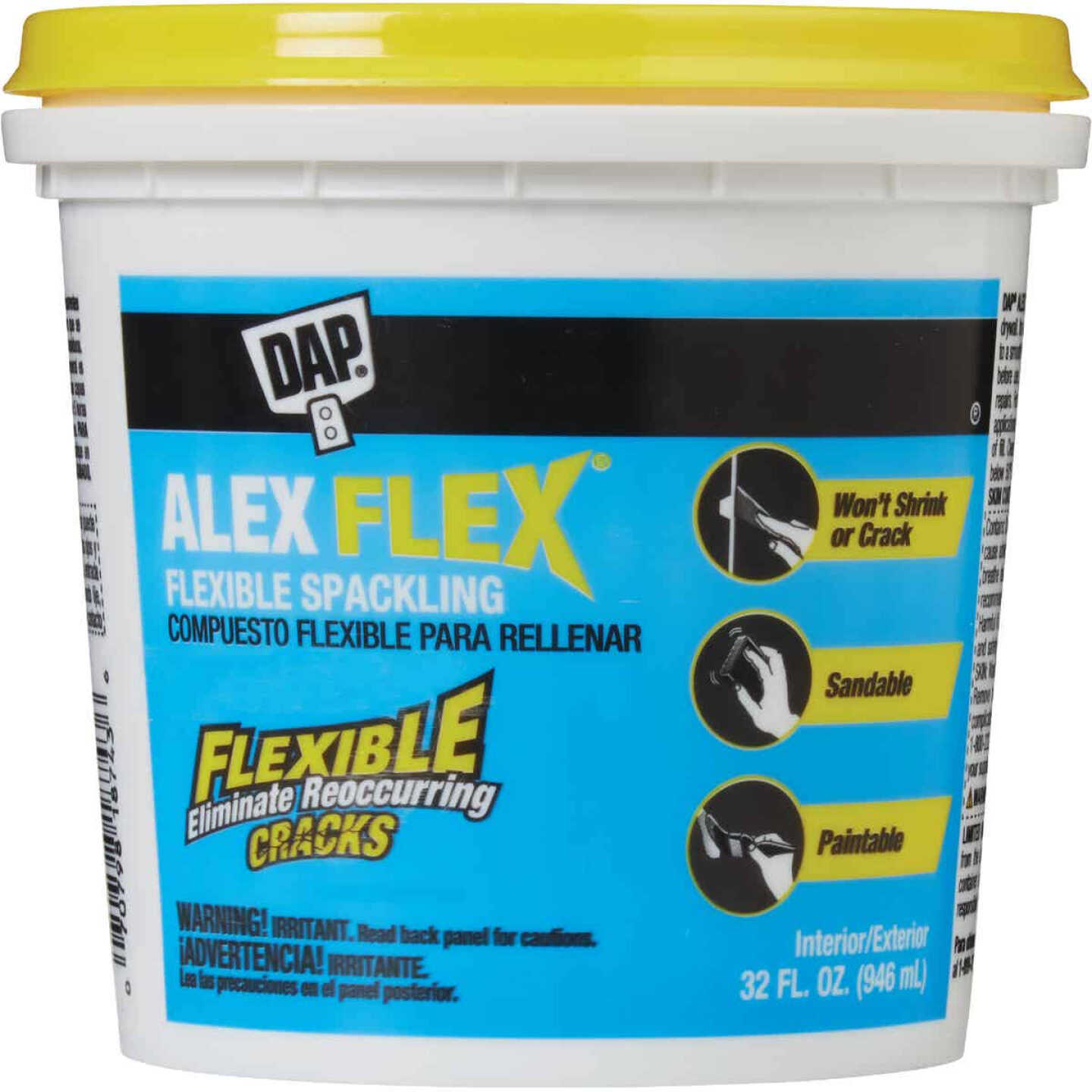 Flexible spackling provides a solution to eliminate reoccurring cracks in drywall, plaster walls and ceilings. Ready-to-use latex polymer formula spreads easily for fast, flexible repairs. Paintable and can be sanded to a smooth finish. Superior adhesion – will not sink or shrink. Interior/exterior use.